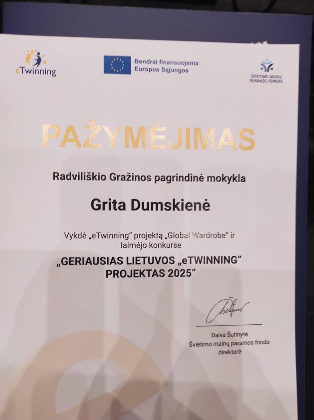 Spalio 8 d. anglų kalbos mokytoja Grita dalyvavo Nacionaliniuose eTwinning projektų apdovanojimuose, kurių metu buvo pagerbti mokytojai ir švietimo įstaigos, sėkmingai įgyvendinusios tarptautinius bendradarbiavimo projektus.