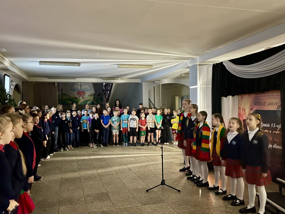 Sausio 13-osios rytą mokykloje taip pat skambėjo dainos, klasėse buvo žiūrimi filmai apie tragiškus įvykius prie televizijos bokšto, Seimo rūmų. Mokiniai klausėsi laisvės gynėjų prisiminimų apie tą klaikią sausio naktį. Mokykla prisijungė prie respublikos pilietinės akcijos „Pergalės šviesa“. Ant palangių sužibo atminties žvakelės, o mokyklos kieme degė laisvės aukuras. 3–4 klasių mokiniai mokyklos fojė prie atminimų stendo skaitė patriotinę poeziją, dainavo liaudies dainas. Istorijos mokytoja ekspertė L.Škėmienė papasakojo apie šios dienos svarbą mūsų tautai ir jos laisvei.