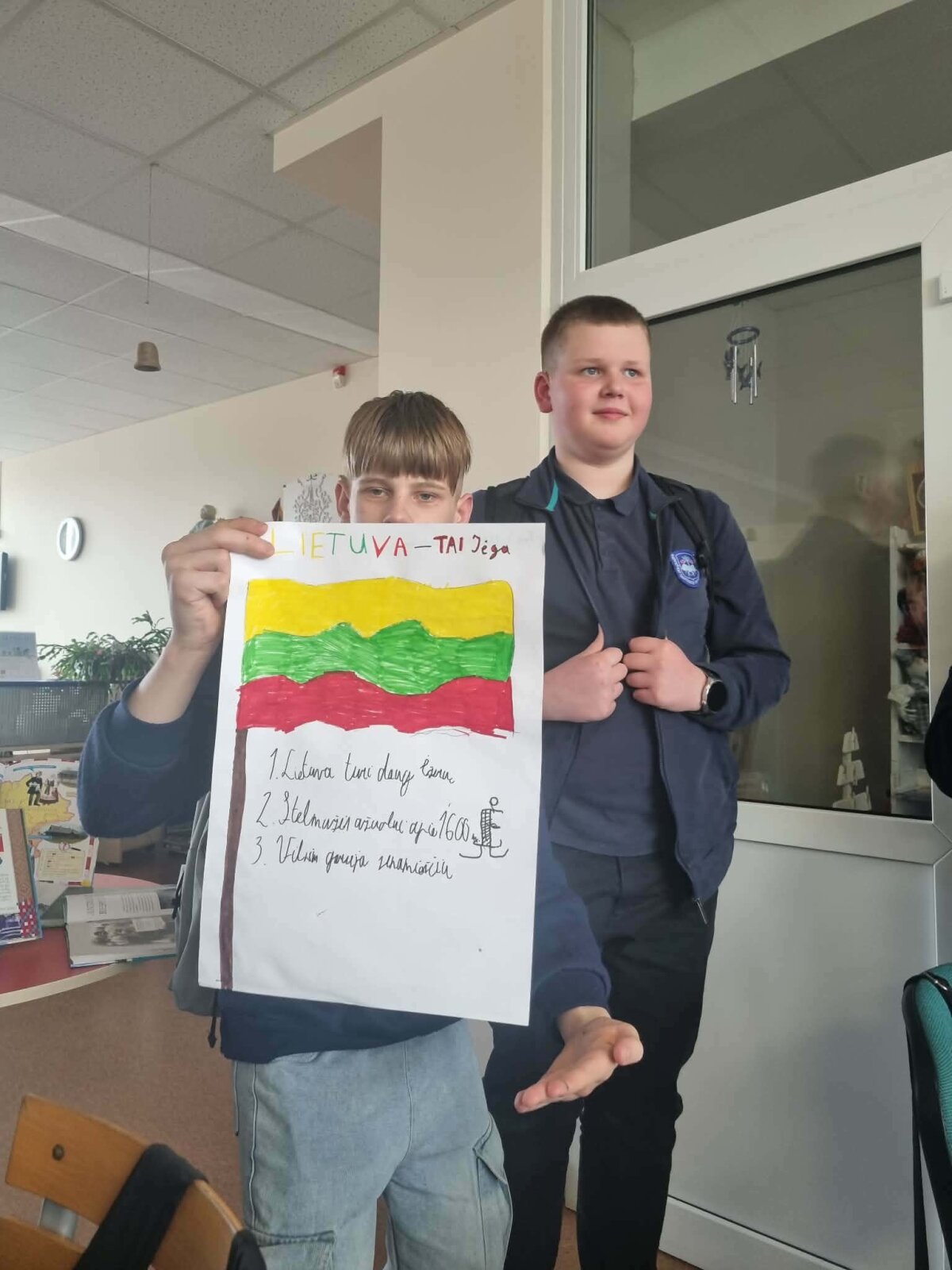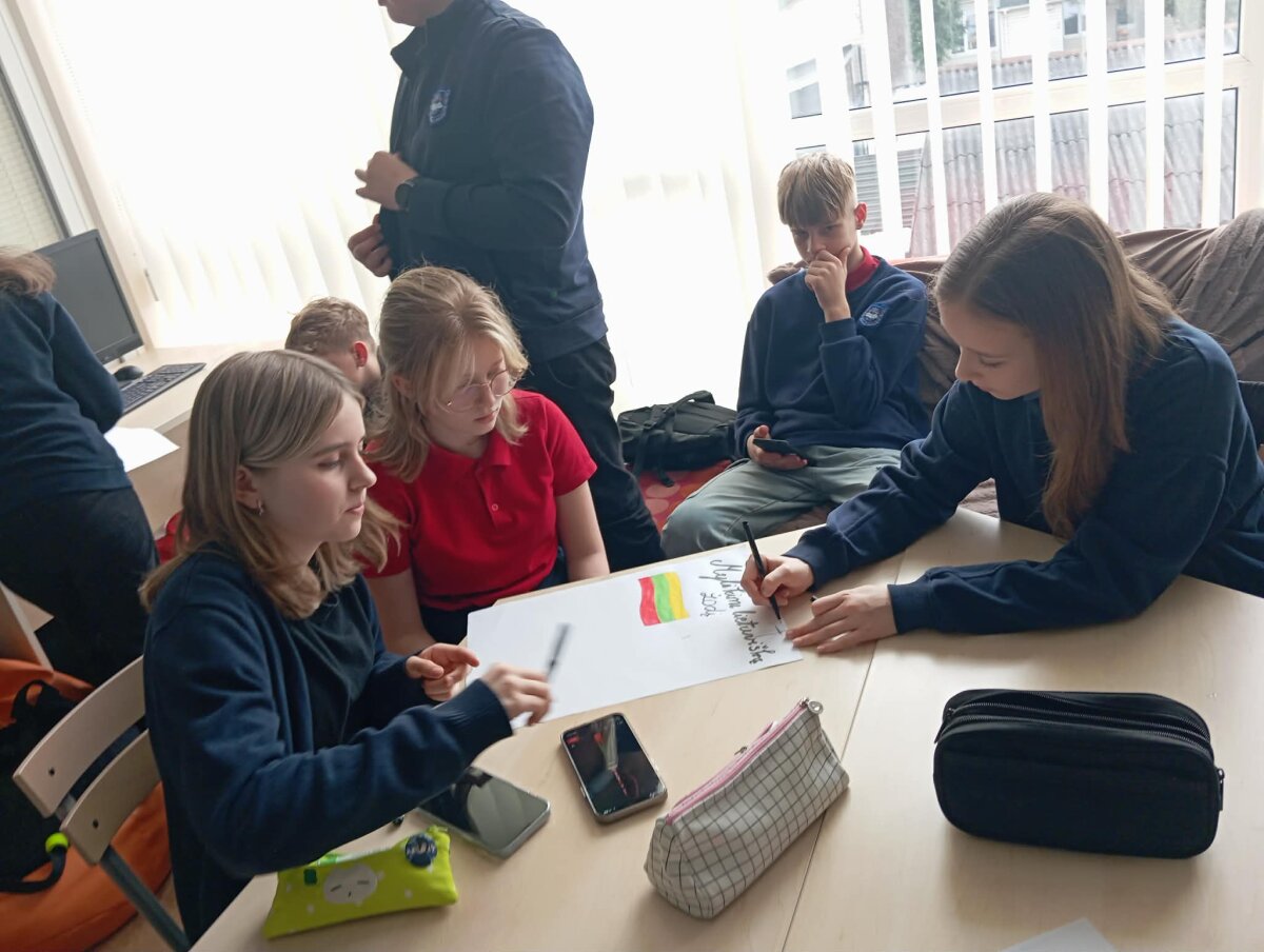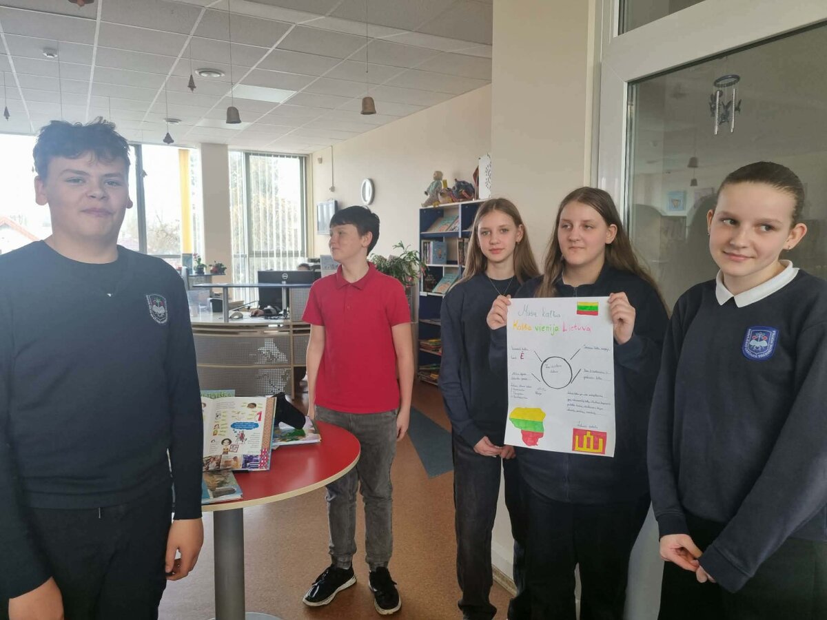 Kovo 12 dieną 7b klasės mokiniai lankėsi miesto bibliotekos vaikų skyriuje. Čia vyko pamoka, skirta Lietuvai, lietuvių kalbai. Mokiniai kūrė patriotinius plakatus.